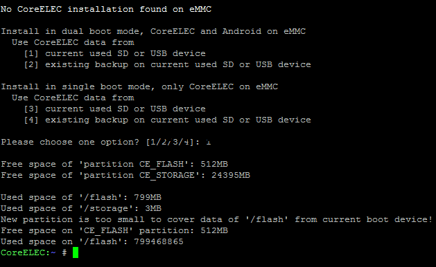 10) vyberte jednu z vyse uvedenych moznosti. Pokud si ze zarizeni nechcete udelat cihlu, pak je lepsi zvolit dual boot, tzn. Android zustane na zarizeni zachovan a bude moci byt nabootovan po zvoleni z vypinaciho menu v CE, popripade bude moci byt obnoven flesnutim boxu (to zde neresim a meli byste u vaseho boxu vedet, jak pripadne na to, kdyz se box brickne) –vyberte tedy „1“ pro dual boot